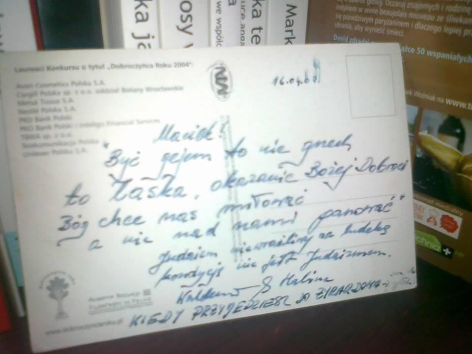 Maciek Nowak: Jeden z najważniejszych listów jakie dostałem w życiu. Kartka od Haliny i Waldemara Radaczów. Ona jest diakonką, on – pastorem kościoła ewangelicko-augsburskiego, wspólnie prowadzą zbór w Żyrardowie, absolwenci teologii, byłem świadkiem na ich ślubie, a potem gościem na konfirmacji ich syna. Napisali: ,,Maciek! Być gejem to nie grzech, to łaska, okazanie Bożej Dobroci. Bóg chce nas miłować, a nie nad nami panować''.