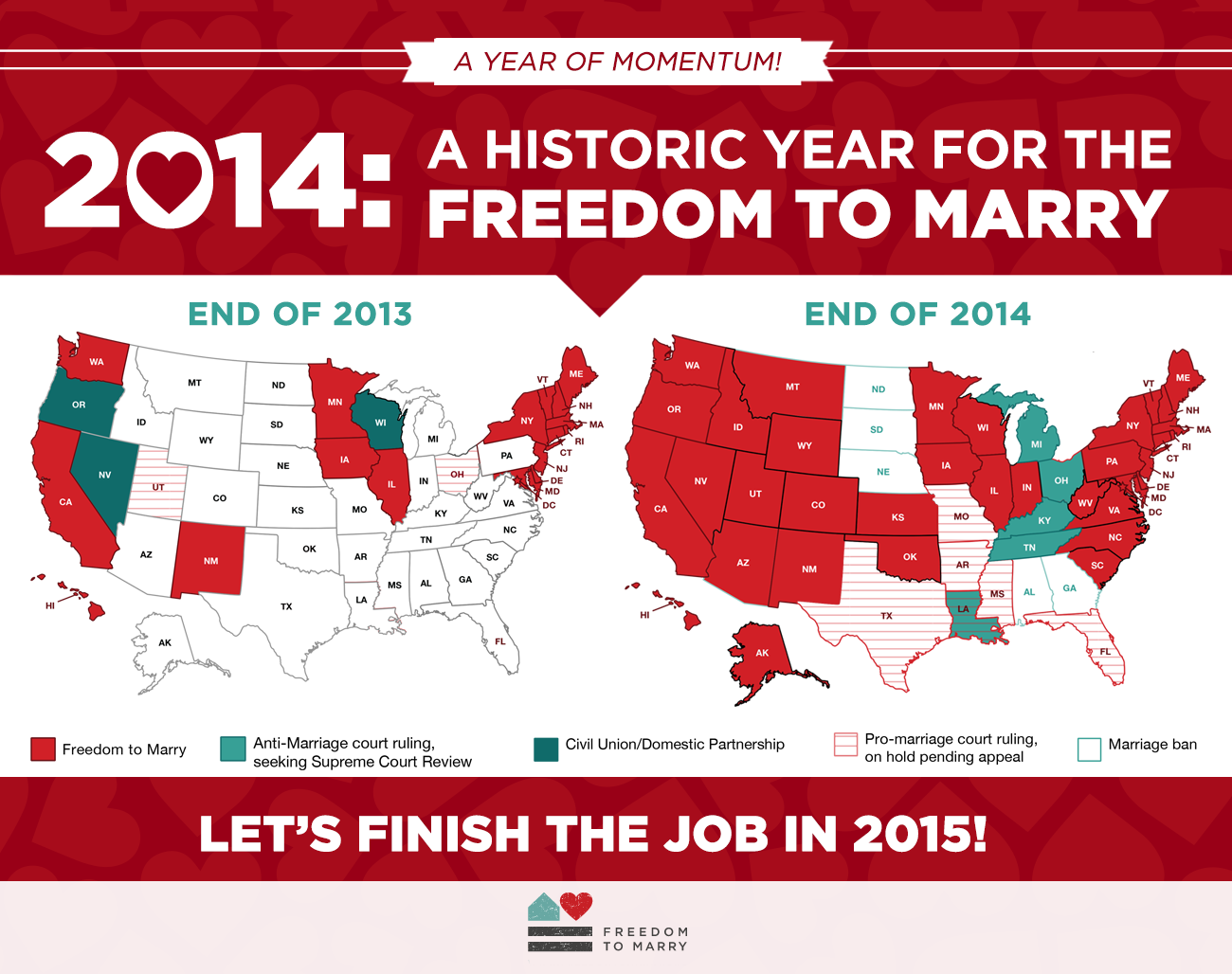 Legalizację jednopłciowy małżeństw/związków partnerskich tym roku to Szkocja, Finlandia, Anglia i Walia, Luksemburg, ponad połowę Ameryki i to stany konserwatywne jak Utah. Chorwacja, Malta, Estonia.