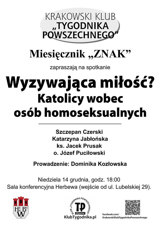 Krakowski Klub „Tygodnika Powszechnego” oraz Miesięcznik „ZNAK” zapraszają na spotkanie pt. ” Wyzywająca miłość? Katolicy wobec osób homoseksualnych”.