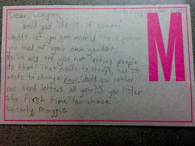 "Drogi Kongresie, czy bylibyście zadowoleni, gdyby ktoś nie pozwolił wam poślubić kochanej przez was osoby tej samej płci? Nie. Więc dlaczego nie pozwalacie na to innym? To musi się zmienić, od razu. Czy wolicie bym wysyłała wam listy przez cały rok? Czy posłuchacie od razu? Wasz wybór. Z poważaniem, Maggie" - list 9-latki z Teksasu o tej treści opublikowali w Internecie rodzice, a sprawę nagłośnił serwis Buzzfeed. Maggie postanowiła, że co tydzień będzie wysyłać politykom list, przypominający o równości małżeńskiej.