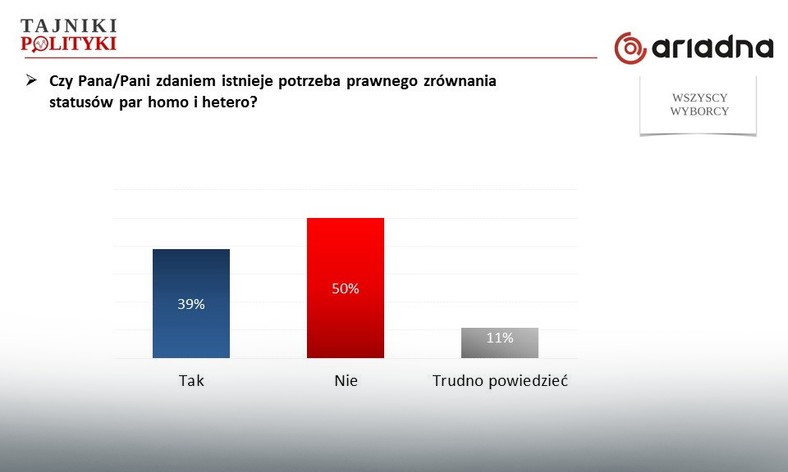 Zapytaliśmy w sondażu Ariadna, czy należałoby wprowadzać nowe przepisy prawne, które dotyczyłyby par jednej płci. Okazało się, że aż 47 proc. osób zgodziło się z tym stwierdzeniem. Wprawdzie badana przez TNS akceptacja to nie to samo, co pytanie o nowe przepisy prawne, ale zaskakuje to, że aż połowa badanych wyraża pośrednio zgodę na legalizację związków homoseksualnych. Ten wynik należałoby powtórzyć, ale to byłby kolejny rezultat świadczący o liberalizacji postaw społecznych w Polsce.