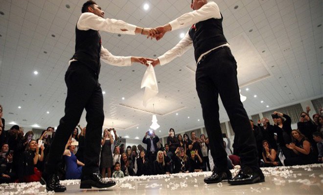 Sam ślub miał tradycyjny charakter - była kolejka znajomych z życzeniami, wręczanie złotych monet (zgodnie z cypryjską tradycją), pierwszy taniec panów młodych do tradycyjnej cypryjskiej melodii oraz - błogosławieństwo dla panów młodych od mam. (GayStarNews/Replika)