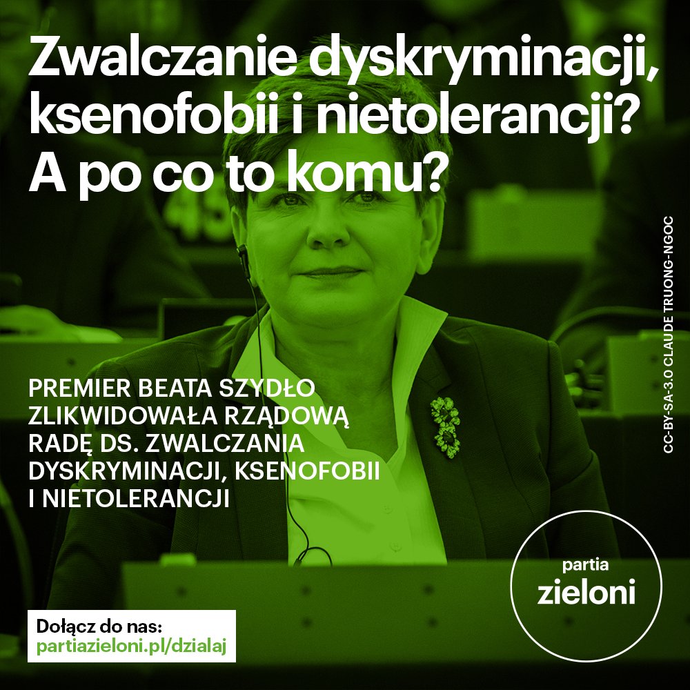 Premier Beata Szydło 27 kwietnia br. wydała zarządzenie, na mocy którego zlikwidowana została Rada do spraw Przeciwdziałania Dyskryminacji Rasowej, Ksenofobii i związanej z nimi Nietolerancji (Zarządzenie nr 53 Prezesa Rady Ministrów z dnia 27 kwietnia 2016 roku, Monitor Polski z 29 kwietnia 2016 roku, poz. 413).