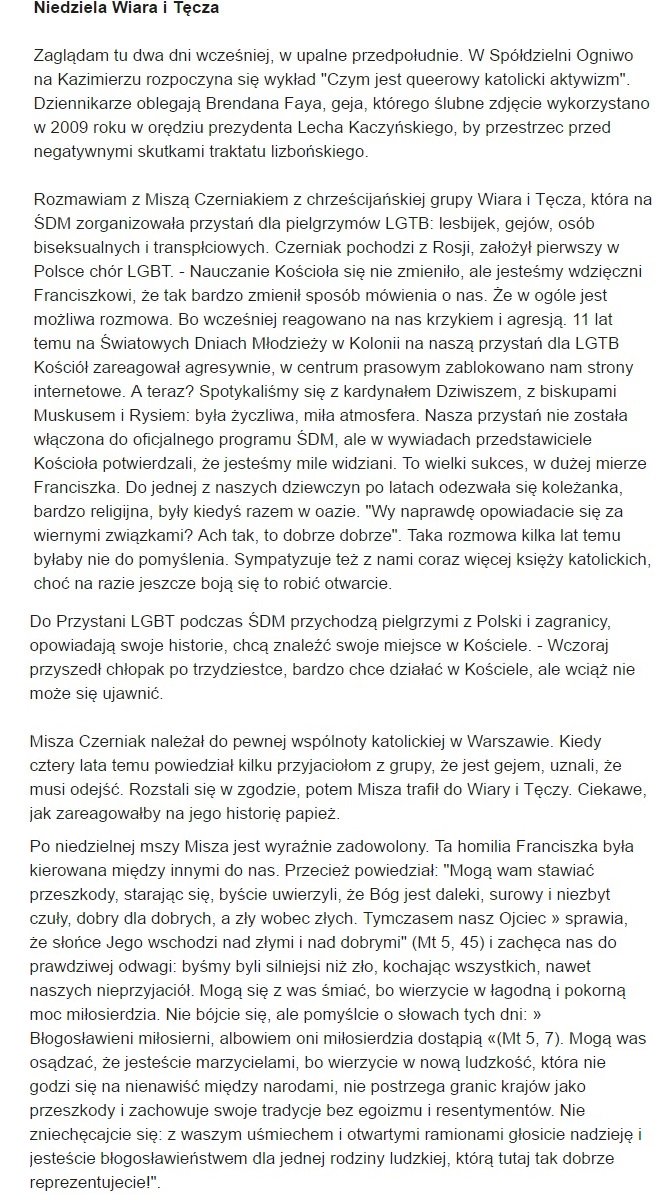 Imad wyciąga komórkę. - Pokażę ci zdjęcie. Ostatnie święta Bożego Narodzenia spędzałem z przyjaciółmi: czworo z nich to chrześcijanie, reszta to muzułmanie, to porządni i wcale niegroźni ludzie. Najgorsze, że tam, gdzie rządzi pieniądz i polityka, wystarczy powiedzieć: "Chrześcijanie są źli, albo muzułmanie są źli, zabierają wam wasze prawa", by zwykli ludzie dali się w tę bajkę wciągnąć. Tak rodzą się konflikty. Terroryzm nie bierze się z islamu, bierze się z polityki. A lęk przed muzułmanami bierze się z niewiedzy. Wczoraj szliśmy ulicą w Krakowie, kolega rozmawiał po arabsku, podszedł Polak, napluł na niego, wyzwał od muzułmanów. Kolega pokazał identyfikator, że jest chrześcijaninem, że przyjechał na Dni Młodzieży. Polak na to: "O, jak chrześcijanin, to przepraszam". Niewiarygodne! Więc przekaż, proszę, Polakom, że naprawdę można żyć razem. Słyszymy w Polsce, że państwo, w którym żyją wyznawcy różnych religii, jest niemożliwe. Jak to niemożliwe! Ktoś chyba wprowadza was w błąd. Nie dajcie się zwieść politykom, mediom, jeśli straszą was muzułmanami. Wpadnijcie do Libanu, zobaczycie, jacy są fajni (...) - Duży Format.