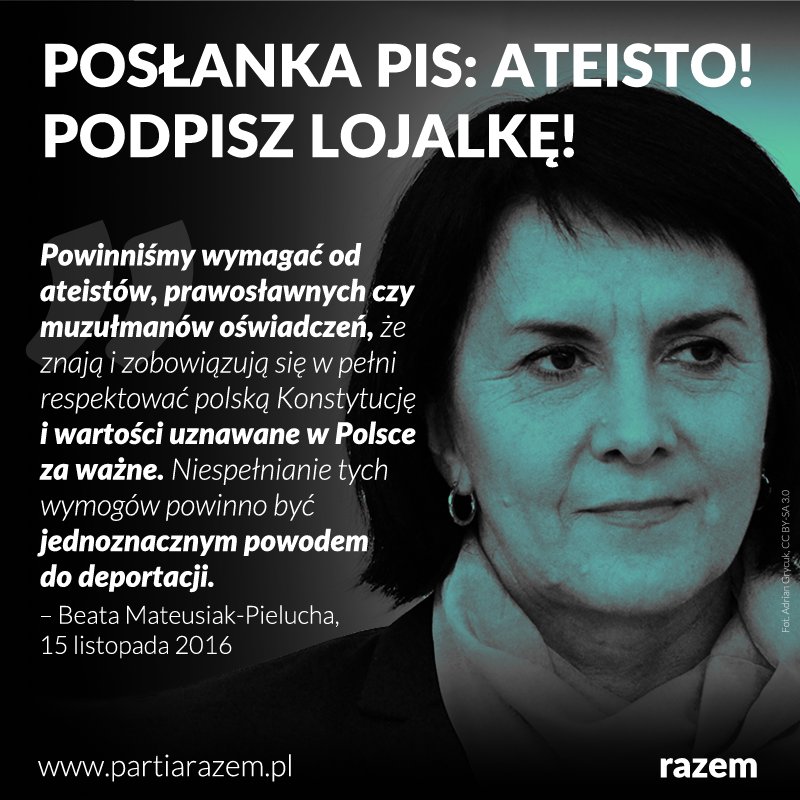 Polska nie jest państwem wyznaniowym. Konstytucja RP zapewnia wolność sumienia i religii, a także zabrania zmuszania obywateli i obywatelek do ujawniania swoich przekonań. Obywatela polskiego nie można wydalić z kraju albo zabronić mu powrotu do kraju. Posłanka PiS z Sieradza Beata Mateusiak-Pielucha chciałaby deportować m.in. Adama Małysza, Wisławę Szymborską czy Józefa Bema - Partia Razem.