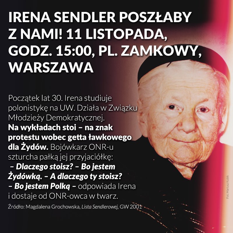 Nie możemy zachować obojętności, gdy w Polsce odradza się nacjonalizm, a neofaszyści z ONR są wspierani przez władze. Trzeba się sprzeciwiać - jak Irena Sendler kilkadziesiąt lat temu. 11 listopada idziemy Za wolność naszą i waszą - sprzeciw się nacjonalizmowi - Partia Razem.