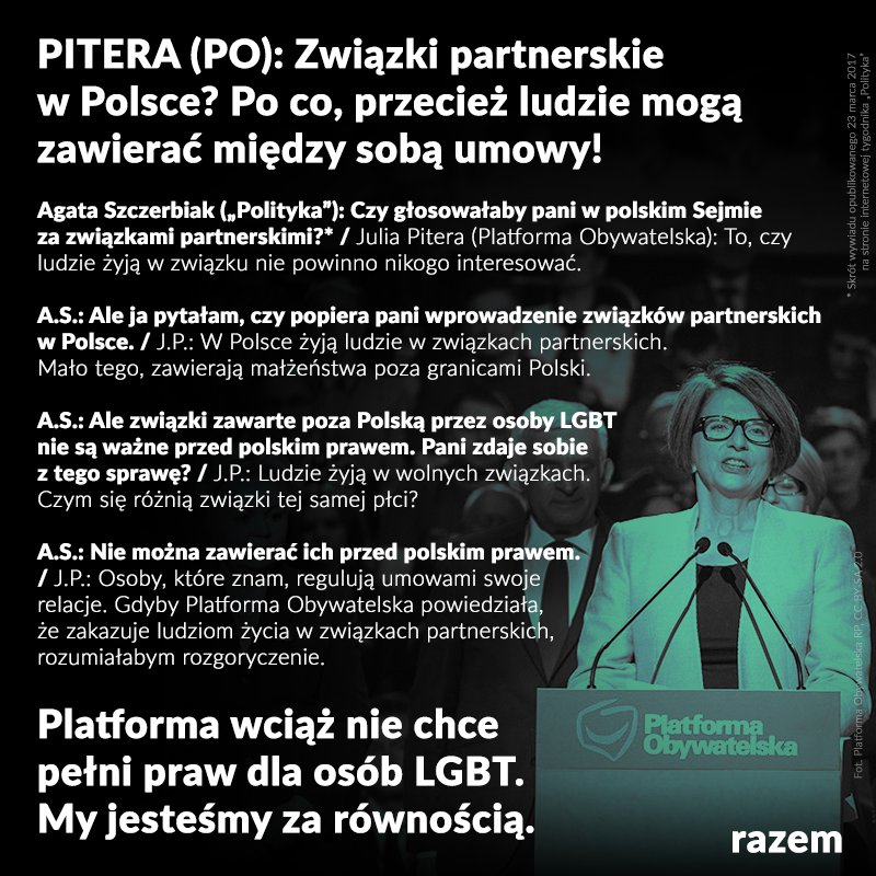 Postanowiliśmy podzielić się z Wami naszym komentarzem: Pani Julio Pitera, przykro nam, że wg Pani prawa człowieka – bo tak należy rozumieć prawa kobiet i osób LGBT+ - nie należą do właściwości Unii Europejskiej. Sądziliśmy, że Traktat o Unii Europejskiej między innymi takie właśnie zapisy zawiera. Przepraszamy też, że 50% światopoglądu, jakim są kobiety, znów zawraca głowę zapracowanej Platformie Obywatelskiej i domaga się poszanowania swych praw. To samo dotyczy osób LGBT+, przecież nasze potrzeby to tylko światopogląd. Możemy podpisać umowę, taką samą, jak zapisuje się z dostawca prądu, czy Internetu. Możemy też liczyć, że w zależności od humoru ktoś łaskawie uwzględni jej zapis i pozwoli nam odwiedzić partnera lub partnerkę w szpitalu. Gratulujemy, że Pani nie należy do trzeciej kategorii ludzi i miała Pani wybór zawierając związek małżeński. Czyżby przyznała Pani zatem, że umowa nie jest jednak tak atrakcyjną ofertą?