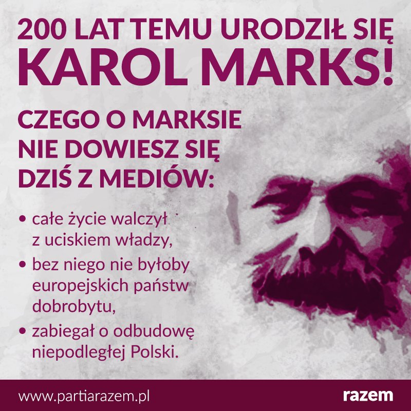 Razem: 200 lat temu w Trewirze urodził się Karol Marks. Instytut Pamięci Narodowej i Wiadomości TVP, Ryszard Petru i Paweł Kukiz, narodowi konserwatyści i twardogłowi wolnorynkowcy – wszyscy próbują obrzydzić Polkom i Polakom tego dziewiętnastowiecznego filozofa. Z pogardą wobec logiki stawiają znak równości pomiędzy Marksem a Stalinem, Bierutem czy Jaruzelskim. Na wieść o uczczeniu okrągłej rocznicy urodzin Marksa przez władze Unii Europejskiej i niemieckich socjaldemokratów polska prawica - ta zamordystyczna, i ta podobno liberalna - dostała histerii. Warto więc wyłożyć otwarcie, dlaczego Razem nie bierze udziału w tej absurdalnej nagonce.