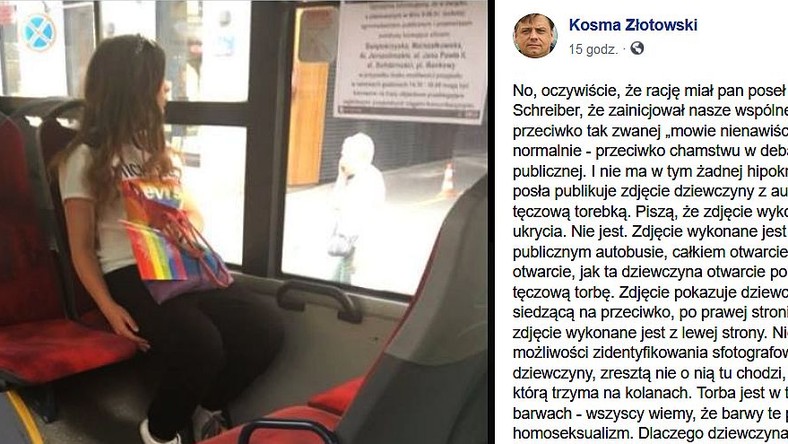 Żona bydgoskiego posła PiS Łukasza Schreibera usunęła kontrowersyjny wpis, w którym zaatakowała młodą dziewczynę, podróżującą autobusem z torebką w kolorach tęczy. Wydawało się, że temat ucichnie, ale swój komentarz do sprawy zamieścił w sieci bydgoski europoseł PiS Kosma Złotowski. Zarzucił pasażerce, że "demonstruje swoje uznanie, poparcie, entuzjazm dla tęczowej flagi".