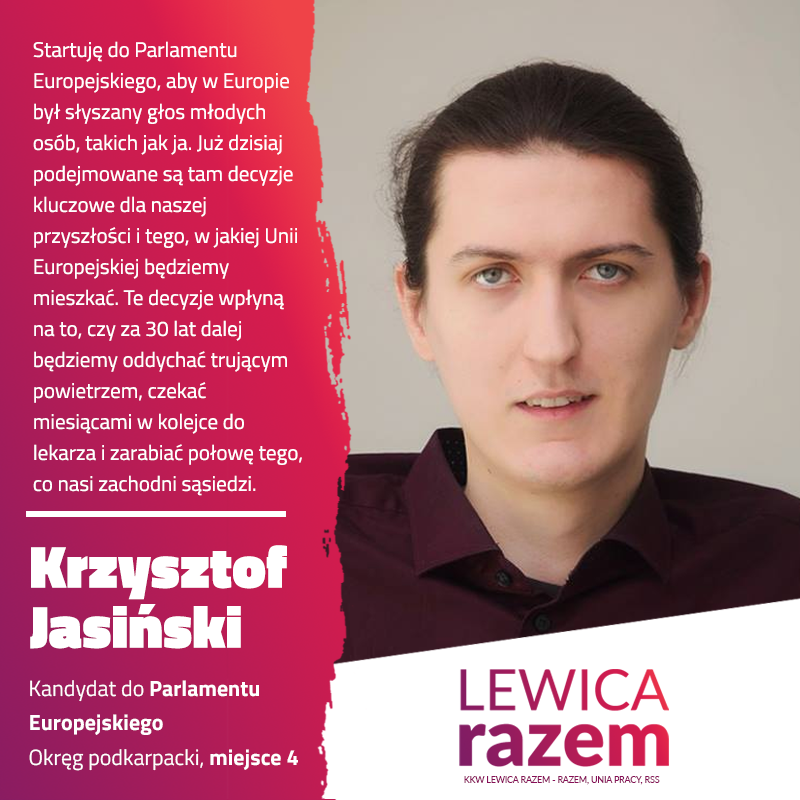 Razem Podkarpackie prezentuje kandydata na liście Lewica Razem - działacza Jakuba Gawrona: "Kandyduję do Parlamentu Europejskiego, aby zająć się przede wszystkim dwoma ważnymi kwestiami: prawami człowieka oraz walką ze zmianami klimatu. Chciałbym, aby Unia Europejska była wspólnotą równych praw i odpowiedzialnej, europejskiej polityki w dziedzinie ochrony środowiska. Są to wyzwania, o które musimy walczyć razem, bo pojedyncze państwa narodowe nie są w stanie im podołać.