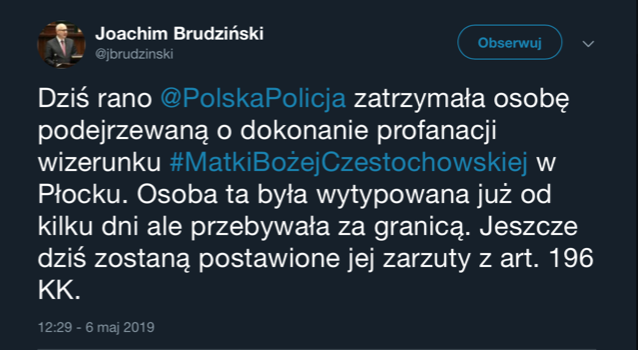 Na ogół demokratyczni politycy chwalą się sukcesami policji wtedy, gdy ta rozbije niebezpieczny gang albo zatrzyma przestępcę stwarzającego zagrożenie dla zdrowia i życia obywateli. Minister Brudziński ma jednak jak widać inne kryteria sukcesu. W poniedziałek na Twitterze pochwalił się, że podległa mu policja zatrzymała „osobę podejrzaną o profanację wizerunku Matki Boskiej Częstochowskiej”.