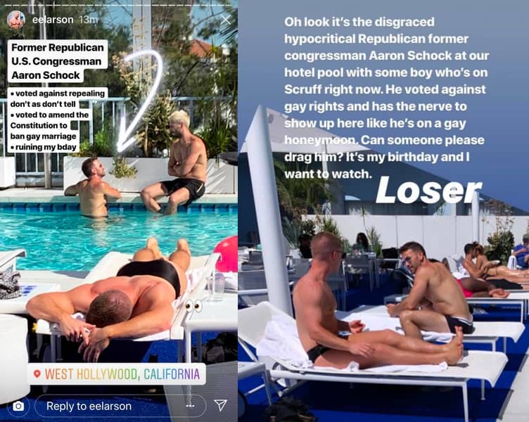 Zdjęcia byłego kongresmana rozpowszechniane w mediach społecznościowych. Schock był na gejowskim miesiącu miodowym, według użytkownika Instagrama, który opublikował zdjęcia.