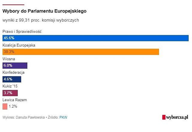 Europa wybrała Polacy wybrali w niedzielę posłów do Parlamentu Europejskiego. Państwowa Komisja Wyborcza ogłosiła w poniedziałek po południu ostateczne wyniki wyborów do Parlamentu Europejskiego. Prawo i Sprawiedliwość otrzymało 45,38 procent głosów, Koalicja Europejska - 38,47, a Wiosna - 6,06 procent głosów. Pozostałe ugrupowania znalazły się poniżej progu wyborczego. Frekwencja wyniosła 45,68 procent - TVN24