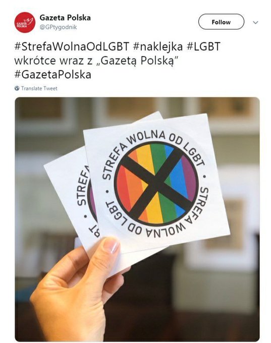 Wlepki z napisem "Strefa wolna od LGBT", które "Gazeta Polska" chce załączyć do kolejnego numeru, rodzą skojarzenia z pierwszą połową XX wieku, gdzie w podobny sposób wykluczano Żydów. Przywodzi to też na myśl czasy segregacji rasowej w Stanach Zjednoczonych, kiedy osobom ciemnoskórym nie wolno było korzystać z tych samych miejsc, które użytkowali biali.