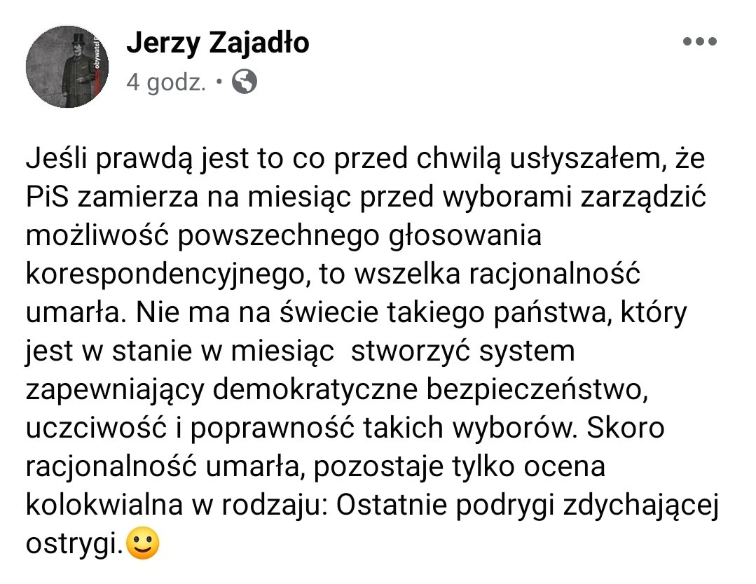 Moim zdaniem będzie tak: PiS potrzyma ludzi w obowiązkowym zamknięciu do świąt. Po świętach nastąpi interwencja najświętszej panienki i TVP pokaże kilku ozdrowieńców. Rząd ogłosi zniesienie ograniczeń w ostatnim tygodniu kwietnia. Ruszy kampania. Duda będzie podkreślał, że przecież wszyscy mogą się wykazać bo przecież proszę jest czas na kampanię i jest demokratycznie. I korzystając z koronawirusowej paniki - wygra. (...)