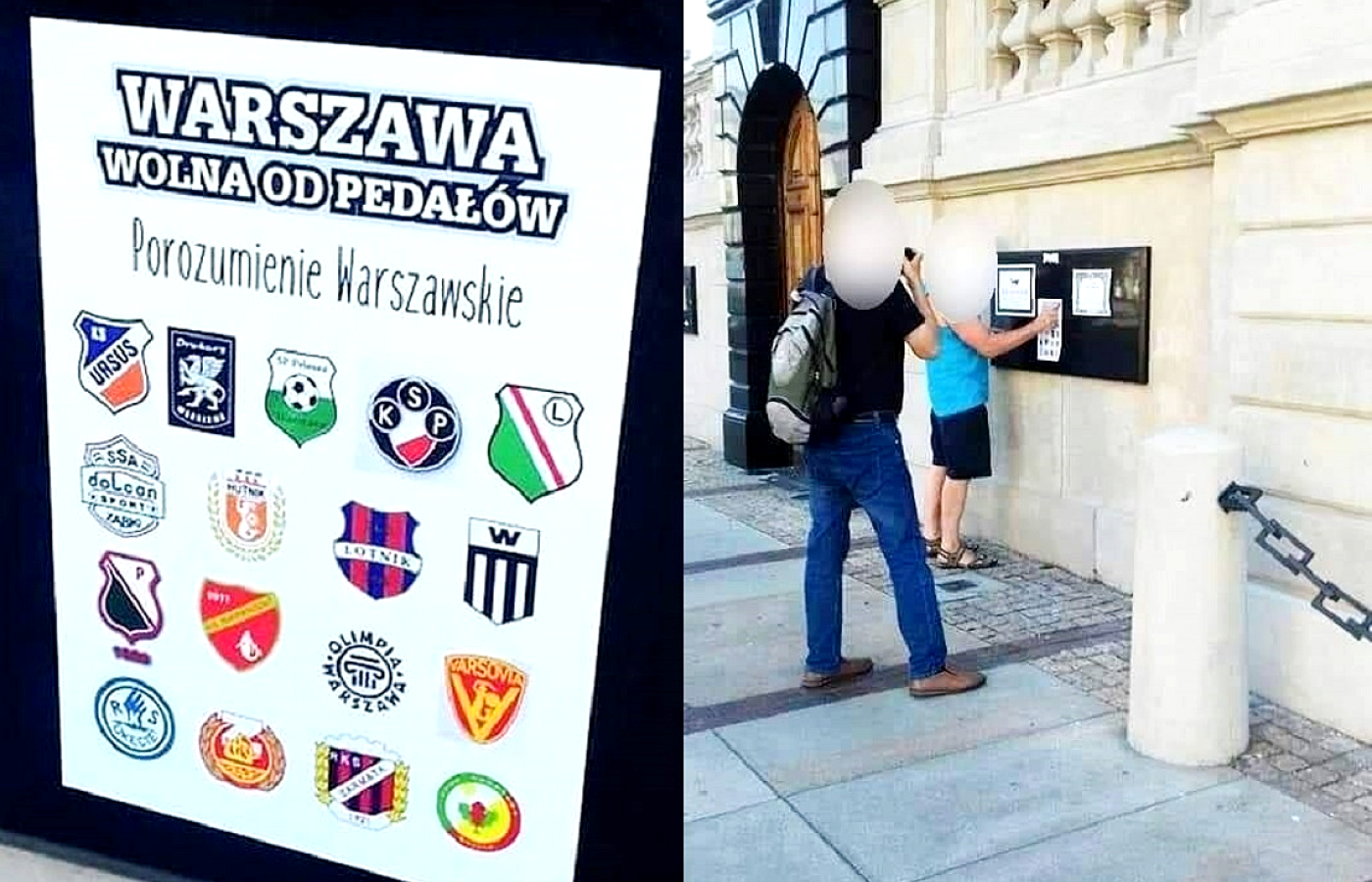 Warszawa wolna od pedałów. Porozumienie Warszawskie” – brzmi kibolskie „ogłoszenie” wywieszone na tablicy przeznaczonej na nekrologi przed Bazyliką Świętego Krzyża w Warszawie.