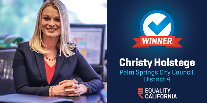 Christy Holstege jest na dobrej drodze, by zostać burmistrzem Palm Springs w Kalifornii, co uczyni ją jedyną biseksualną burmistrzyni w kraju i pierwszą kobietą, która zostanie burmistrzem pustynnego miasta na wschód od Los Angeles.