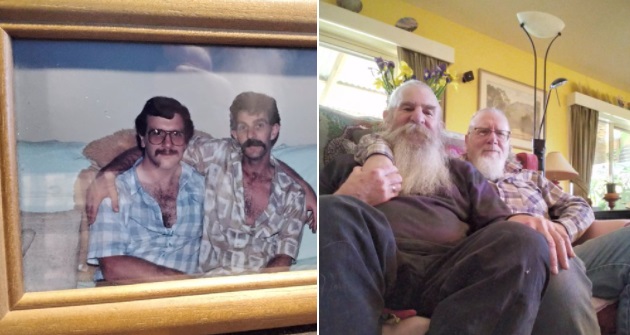 Tweet, który napisał Australijski gej z okazji 35. rocznicy związku. 70-letni Peter Robinson udostępnił zdjęcie siebie i partnera, 64-letniego Murraya Buchanana, jako młodych mężczyzn, obok ich dzisiejszego zdjęcia.
