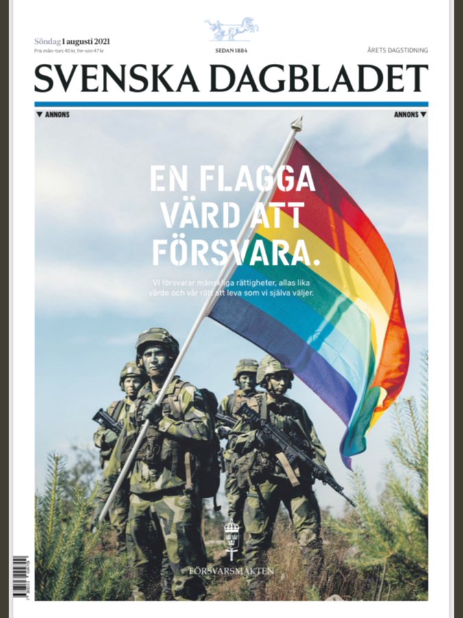 W niedzielę 1 sierpnia na okładce jednej z wiodących szwedzkich gazet - "Svenska Dagbladet", pojawiła się reklama szwedzkiego wojska. Na całej stronie widnieje zdjęcie żołnierzy. Jeden z nich trzyma w dłoni tęczową flagę. Jest też napis, który tłumaczy się jako: "FLAGA, KTÓREJ WARTO BRONIĆ. Bronimy praw człowieka, równości dla wszystkich i naszego prawa do życia tak, jak sami wybierzemy." (Queer.pl)