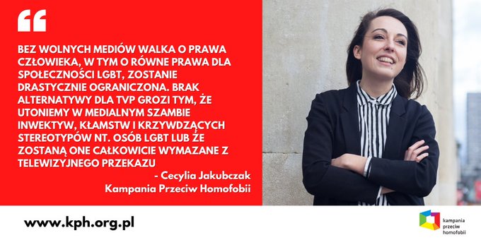 Istnienie wolnych i niezależnych od władzy mediów to jedna z najważniejszych podstaw demokratycznych państwa. Bez nich walka o prawa człowieka, w tym o równe prawa dla społeczności LGBT, zostanie drastycznie ograniczona. W nocy 11 sierpnia zamach na wolność mediów w Polsce stał się faktem. Organizacje takie jak Kampania Przeciw Homofobii potrzebują wolnych mediów, by walczyć o Polskę ludzi równych praw - wyjaśnia Cecylia Jakubczak z Kampanii Przeciw Homofobii.