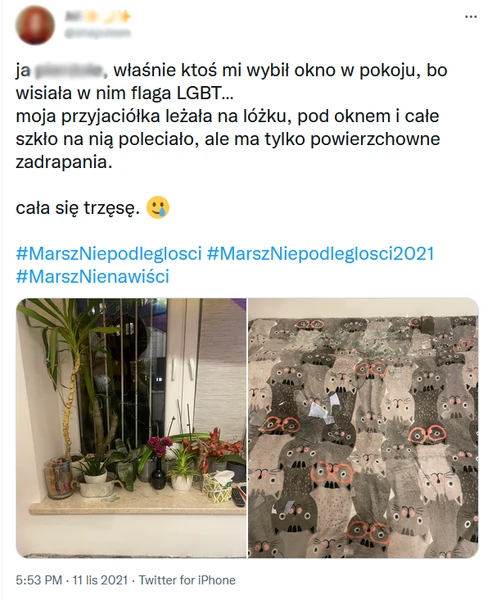 To nie jedyny homofobiczny atak na warszawskie mieszkania, który miał miejsce 11 listopada. Tego samego dnia anonimowa użytkowniczka Twittera pokazała zdjęcia wybitego okna, w którym znajdowała się tęczowa flaga. Jest przekonana, że to narodowcy zaatakowali jej mieszkanie - NOIZZ