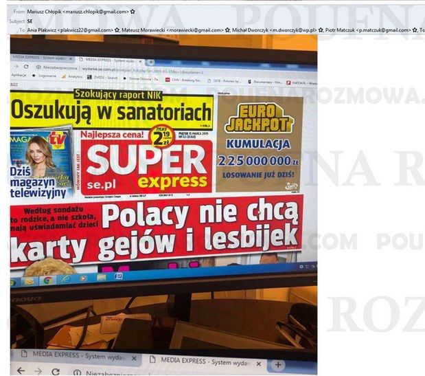 Do wiadomości załączony jest wydruk z wydania "Super Expressu" na kolejny dzień, w którym Zofia Klepacka informuje, że "stała się w Polsce wrogiem nr 1 środowisk homoseksualnych" oraz iż "grożono jej śmiercią". Autor maila stwierdza, że przesyła wydruk z "SE" "zgodnie z rozmową z Michałem i Krzyśkiem".