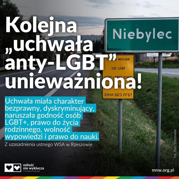"WSA w Rzeszowie stwierdził dziś nieważność w całości uchwały Rady Gminy Niebylec o przeciwdziałaniu tzw. “ideologii LGBT”. To już 7 sprawa, w której Sąd w pełni uwzględnił argumentację i zarzuty Rzecznika Praw Obywatelskich, który zaskarżył 9 uchwał tego typu w 2019 roku.