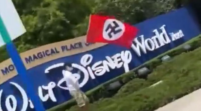 Skrajna prawica protestuje przeciw Disneyowi. Nagranie wideo pokazało ludzi wymachujących nazistowskimi flagami przy wejściu do Disney World w Orlando na Florydzie w sobotę.