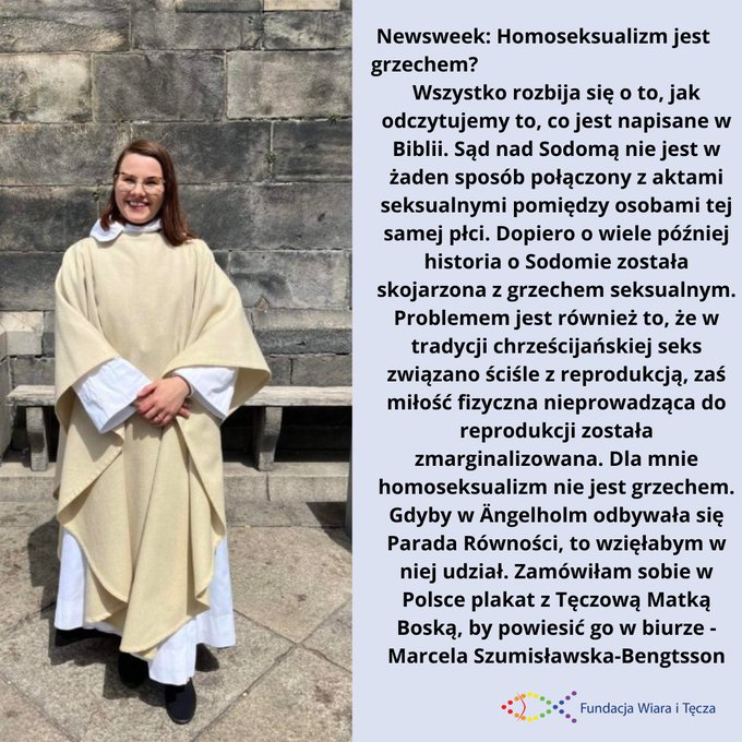 Homoseksualizm jest grzechem? - Wszystko rozbija się o to, jak odczytujemy to, co jest napisane w Biblii. Sąd nad Sodomą nie jest w żaden sposób połączony z aktami seksualnymi pomiędzy osobami tej samej płci. Dopiero o wiele później historia o Sodomie została skojarzona z grzechem seksualnym. Problemem jest również to, że w tradycji chrześcijańskiej seks związano ściśle z reprodukcją, zaś miłość fizyczna nieprowadząca do reprodukcji została zmarginalizowana. Dla mnie homoseksualizm nie jest grzechem. Gdyby w Ängelholm odbywała się Parada Równości, to wzięłabym w niej udział. Zamówiłam sobie w Polsce plakat z Tęczową Matką Boską, by powiesić go w biurze (...) - Newsweek Polska.
