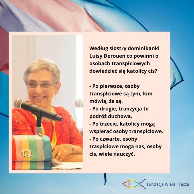 Czego wg siostry Derouen powinni o osobach transpłciowych dowiedzieć się katolicy cis? Po pierwsze, osoby transpłciowe są tym, kim mówią, że są. Po drugie, tranzycja to podróż duchowa. Po trzecie, katolicy mogą wspierać osoby transpłciowe. Po czwarte, osoby traspłciowe mogą nas, osoby cis, wiele nauczyć. (https://bit.ly/3BK7PTQ) - Fundacja Wiara i Tęcza