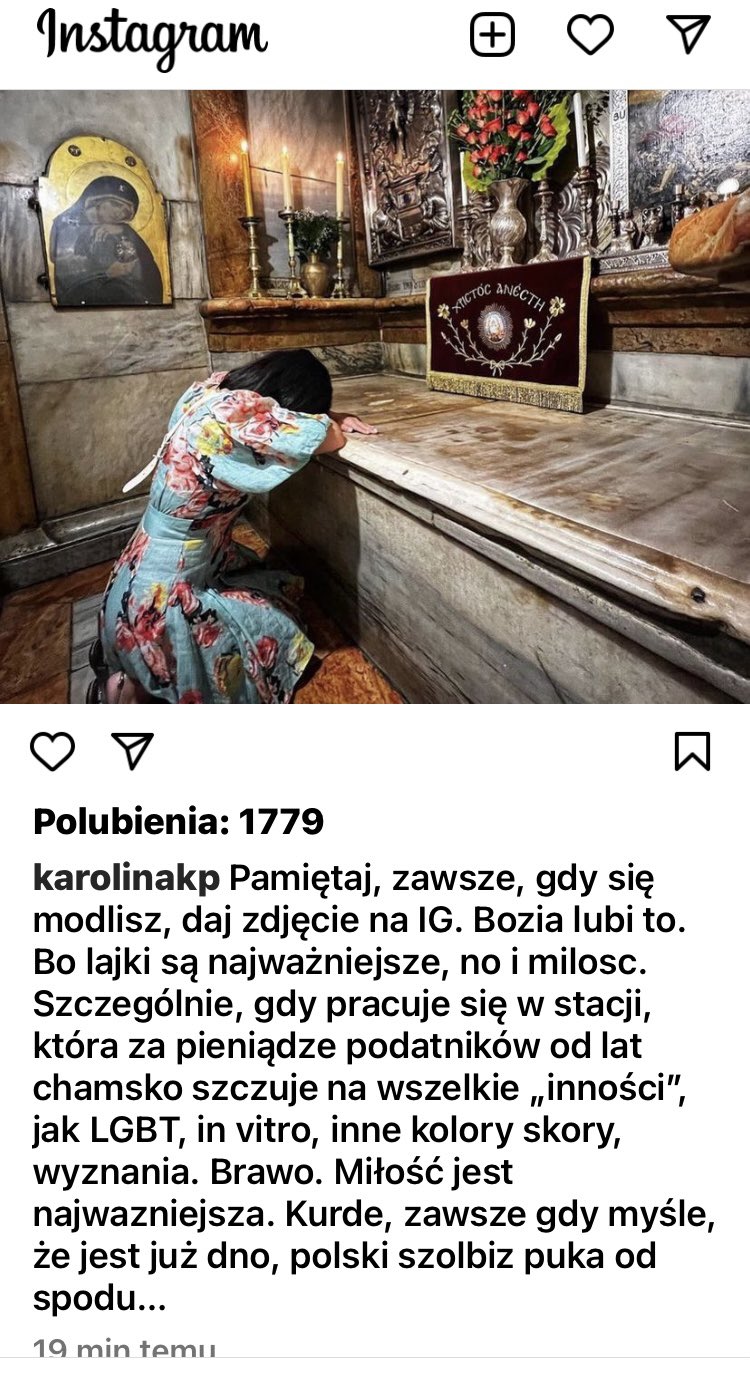 'Pamiętaj, zawsze, gdy się modlisz, daj zdjęcie na IG. Bozia lubi to. Bo lajki są najważniejsze, no i miłość. Szczególnie gdy pracuje się w stacji, która za pieniądze podatników od lat chamsko szczuje na wszelkie "inności" jak LGBT, in vitro, inne kolory skóry, wyznania. Brawo. Miłość jest najważniejsza. Kurde, zawsze, gdy myślę, że jest już dno, polski szołbiz puka od spodu... Karolina Korwin-Piotrowska - Na Temat.pl.