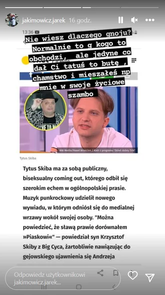 Niedawno syn Krzysztofa Skiby, lidera Big Cyc, dokonał coming outu jako osoba biseksualna. Tytus Skiba opowiedział przy okazji m.in. o swojej relacji z ojcem. W rozmowie młody Skiba nawiązał też do poglądów Jarosława Jakimowicza, kontrowersyjnego gwiazdora TVP. Jakimowicz zdecydował się na to odpowiedzieć - onet.pl.