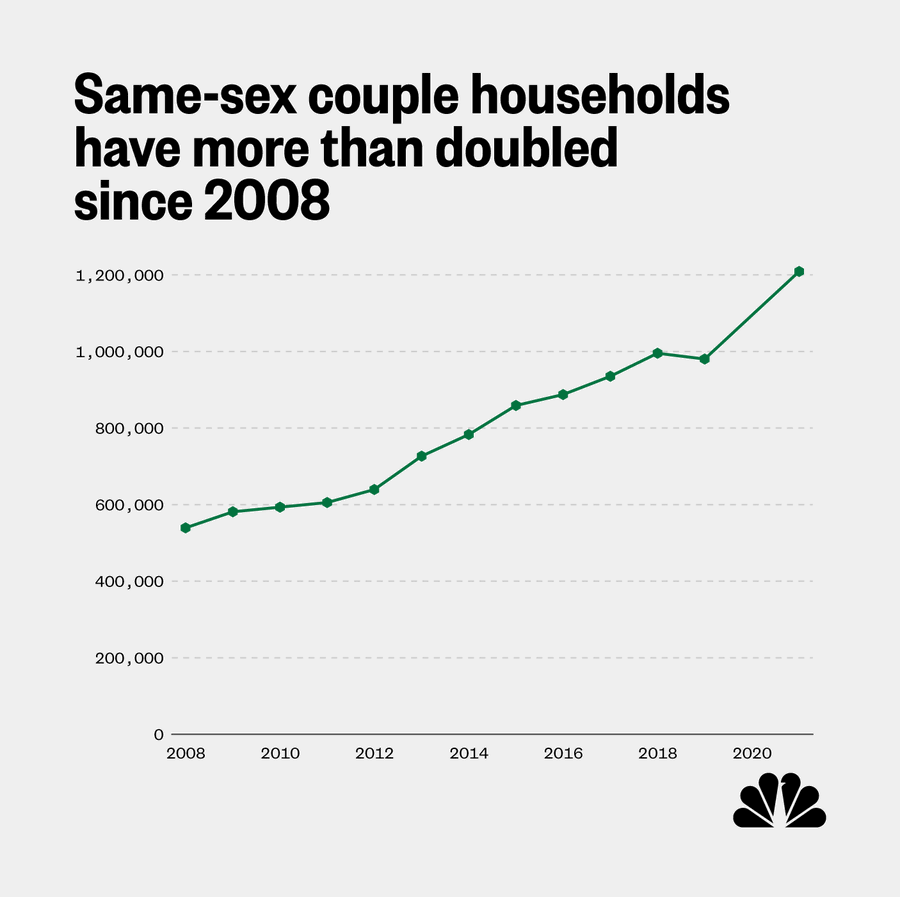 Według danych US Census Bureau w Stanach Zjednoczonych istnieje ponad 1,2 miliona gospodarstw domowych to pary tej samej płci. Dane pokazały również, że w Stanach Zjednoczonych mieszka więcej par jednopłciowych niż kiedykolwiek wcześniej, co ma sens, biorąc pod uwagę fakt, że równość małżeńska została zalegalizowana w całym kraju dopiero w 2015 roku