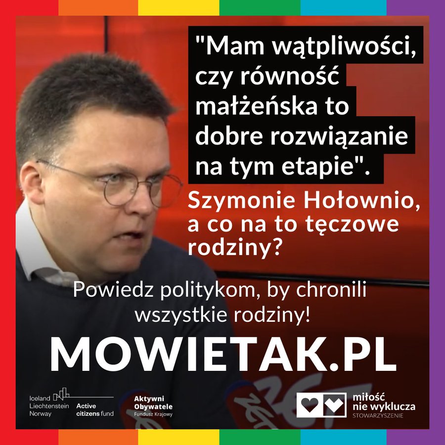 Panie Hołownio, czy to samo powiedziałby pan tysiącom tęczowych rodzin żyjących w Polsce i wychowujących dzieci? Że żeby liczyć na pełną ochronę ze strony Państwa muszą, oprócz opieki nad swoimi dziećmi, zajmować się jeszcze tłumaczeniem politykom, dlaczego zasługują na pełnię praw?