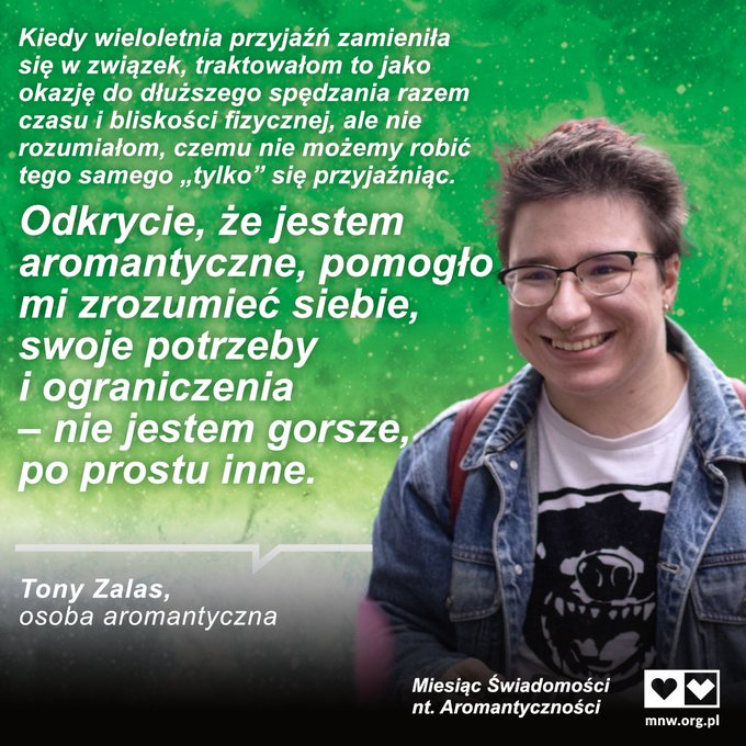 Drogie osoby aromantyczne - z okazji Waszego święta życzymy Wam zrozumienia i dobrych sojuszników i sojuszniczek. Wiedzcie, że w Miłości zawsze jest dla Was miejsce – niezależnie od tego, gdzie znajdujecie się na spektrum aromantyczności - Miłość Nie Wyklucza.