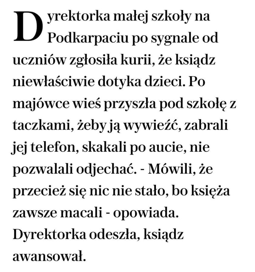 Dyrektorka podkarpackiej szkoły zgłosiła kurii, że dzieci skarżą się na niewłaściwy dotyk ze strony księdza, który uczył religii. Mieszkańcy wsi chcieli wywieźć kobietę na taczkach i skakali po jej aucie. Twierdzili, że przesadza, bo przecież "księża zawsze macali". Dyrektorka odeszła ze stanowiska, a ksiądz nadal służy w parafii — informuje "Gazeta Wyborcza" - onet.pl