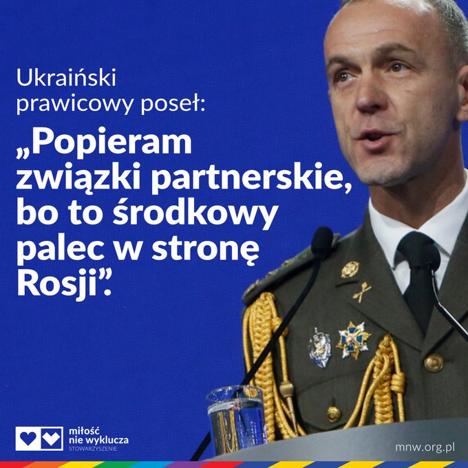 ”Będę popierał wszystko, czego nienawidzi nasz wróg. Jeśli tego nie będzie w Rosji, to powinno być tutaj, w Ukrainie — żeby pokazać im, że się różnimy. Ta ustawa jest jak uśmiech w stronę Europy i środkowy palec w stronę Rosji. Ma moje poparcie”.
