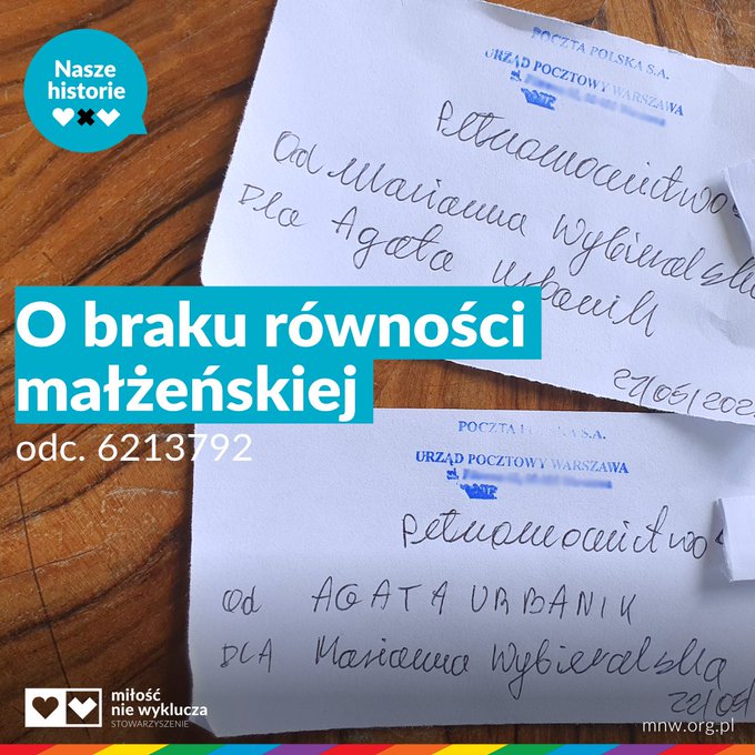 Tymczasem znamy przypadki, gdzie żona odbiera listy polecone do jej zmarłego męża bez żadnych dodatkowych dokumentów — dla poczty polskiej najważniejsze jest to, że para jest różnopłciowa.