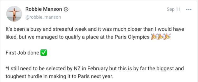 Odwiedzając stronę OnlyFans Mansona (@robbie_manson), można zobaczyć, że nowy post został udostępniony w poniedziałek, 11 września, aby uczcić fakt zakwalifikowania się na igrzyska olimpijskie w miniony weekend.