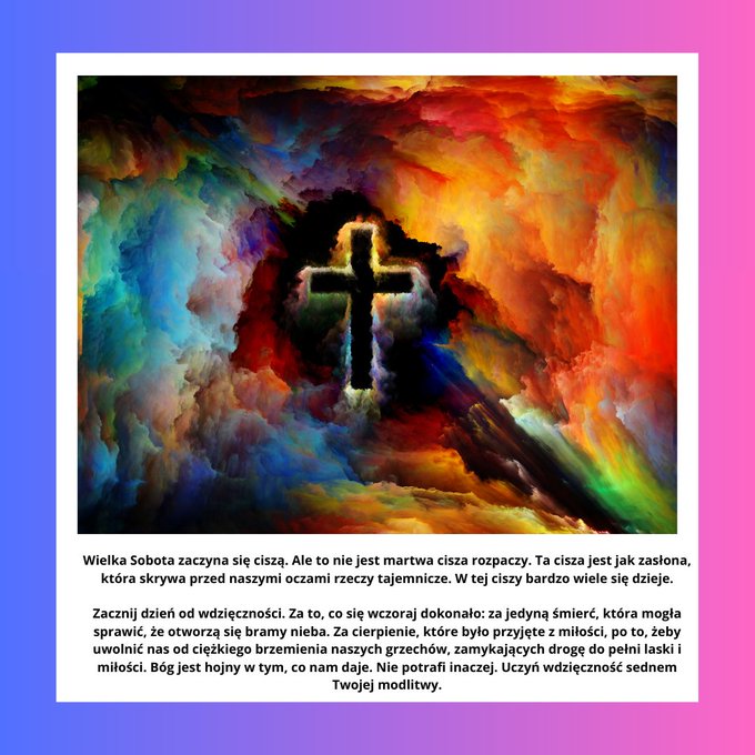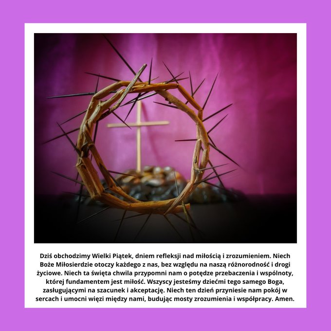 Dziś obchodzimy Wielki Piątek, dniem refleksji nad miłością i zrozumieniem. Niech Boże Miłosierdzie otoczy każdego z nas, bez względu na naszą różnorodność i drogi życiowe. Niech ta święta chwila przypomni nam o potędze przebaczenia i wspólnoty, której fundamentem jest miłość. Wszyscy jesteśmy dziećmi tego samego Boga, zasługującymi na szacunek i akceptację. Niech ten dzień przyniesie nam pokój w sercach i umocni więzi między nami, budując mosty zrozumienia i współpracy. Amen.