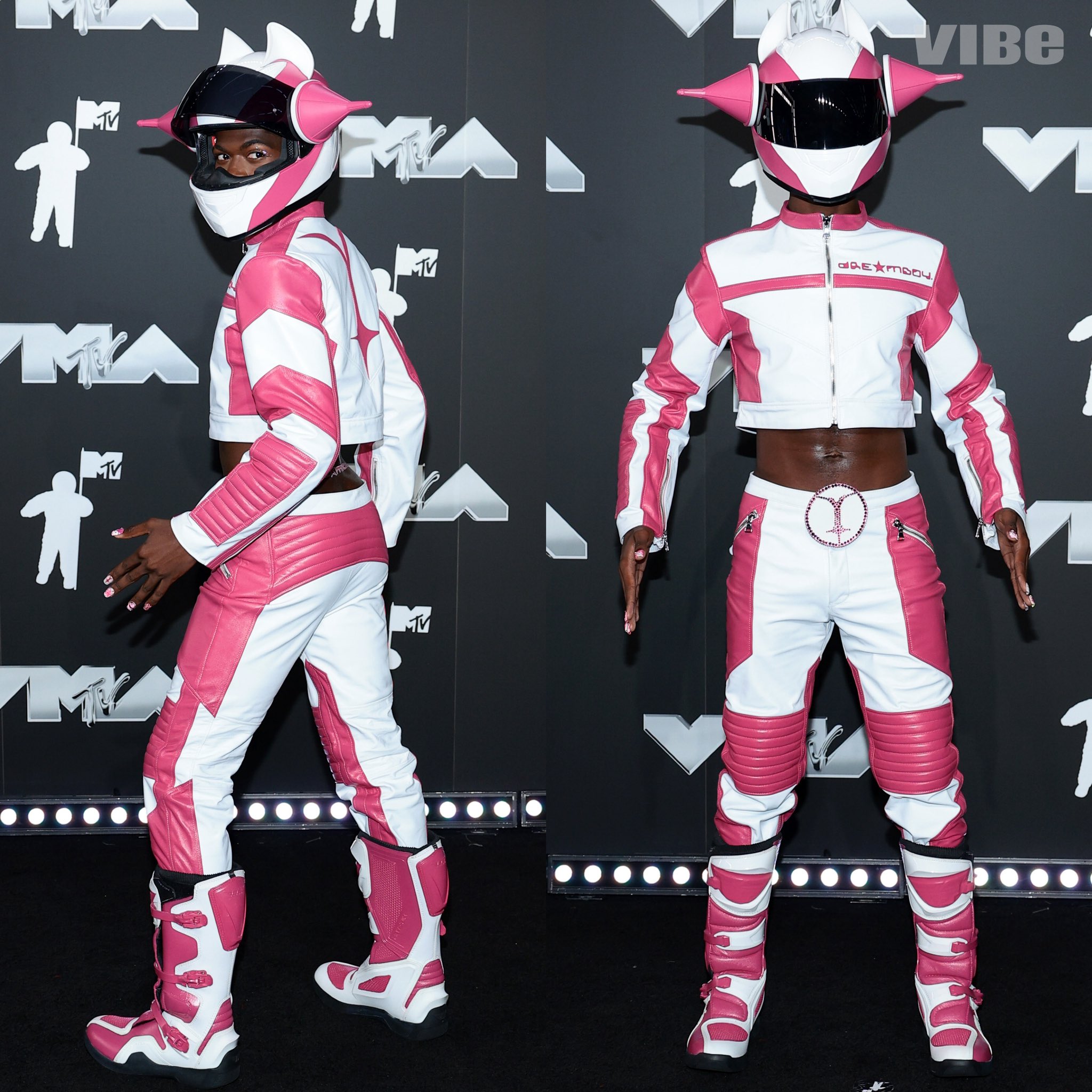 Lil Nas X z kolei pojawił się na MTV VMA w stroju inspirowanym motocyklistami – biało-różowe skórzane spodnie z dopasowaną, odsłaniającą brzuch kurtką. Ostateczny akcent do stylizacji dodał kask, który ukrywał tożsamość – ten sam, który z łatwością można sobie wyobrazić na DL topie, nalegającym, by go nie zdejmować podczas spotkania.