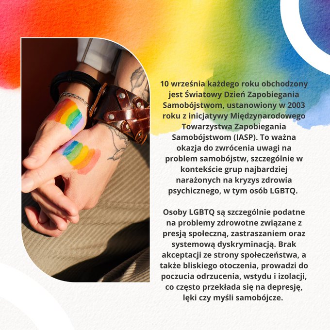 10 września każdego roku obchodzony jest Światowy Dzień Zapobiegania Samobójstwom, ustanowiony w 2003 roku z inicjatywy Międzynarodowego Towarzystwa Zapobiegania Samobójstwom (IASP). To ważna okazja do zwrócenia uwagi na problem samobójstw, szczególnie w kontekście grup najbardziej narażonych na kryzys zdrowia psychicznego, w tym osób LGBTQ. Choć każdy może zmagać się z problemami psychicznymi, społeczność LGBTQ boryka się z wyzwaniami, które zwiększają ryzyko zachowań samobójczych, a głównymi czynnikami są dyskryminacja, homofobia oraz brak akceptacji.