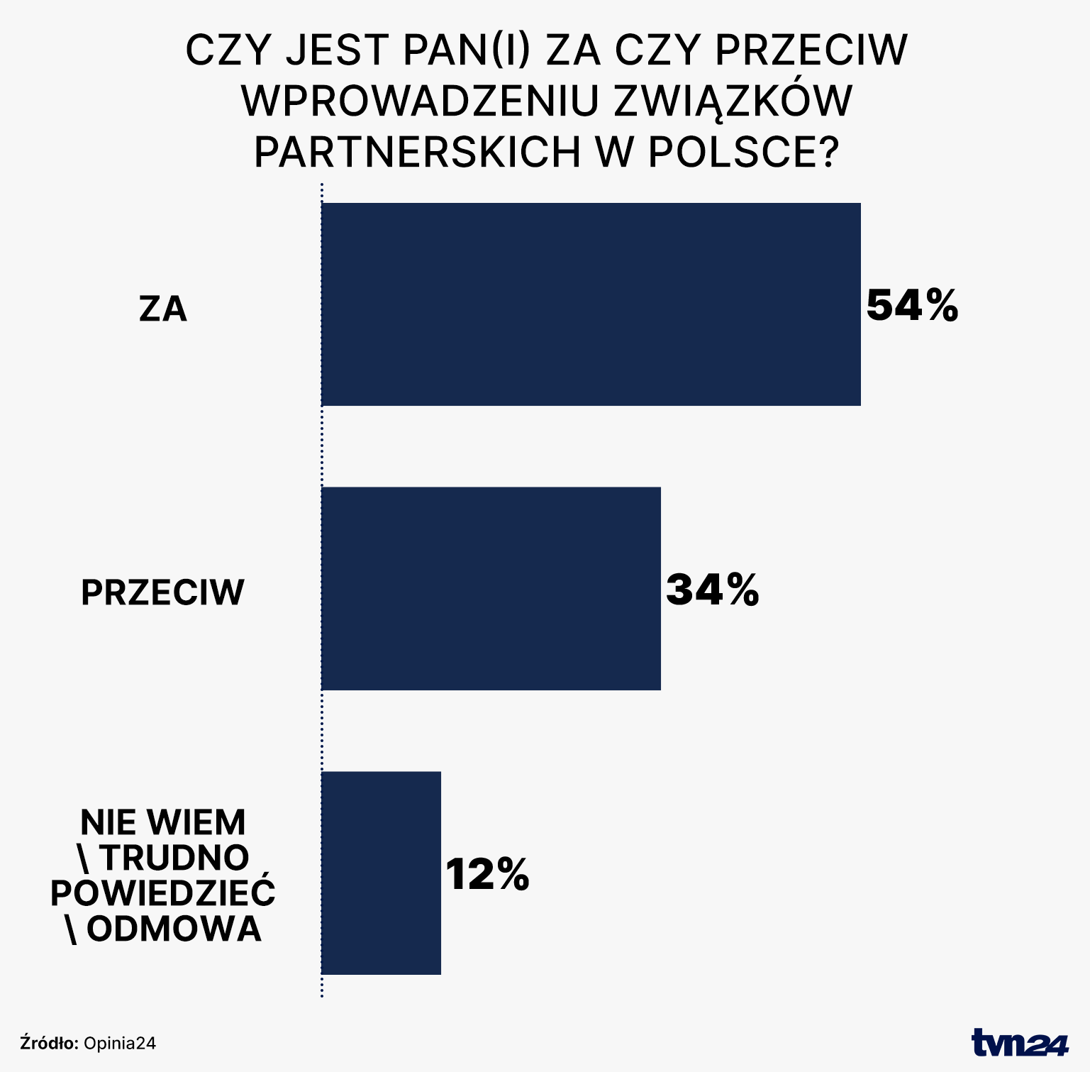 34 procent badanych stwierdziło, że jest "przeciw" wprowadzeniu związków partnerskich w Polsce, a 12 procent odpowiedziało: "nie wiem/trudno powiedzieć/odmowa".