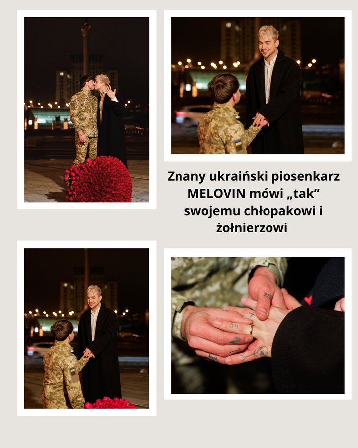 „Na Majdanie, gdzie Ukraina walczy o swoją wolność, wybrała swoją.” Znany ukraiński piosenkarz MELOVIN mówi „tak” swojemu chłopakowi i żołnierzowi Petro podczas ceremonii zaręczynowej w najbardziej świętym miejscu na Ukrainie.